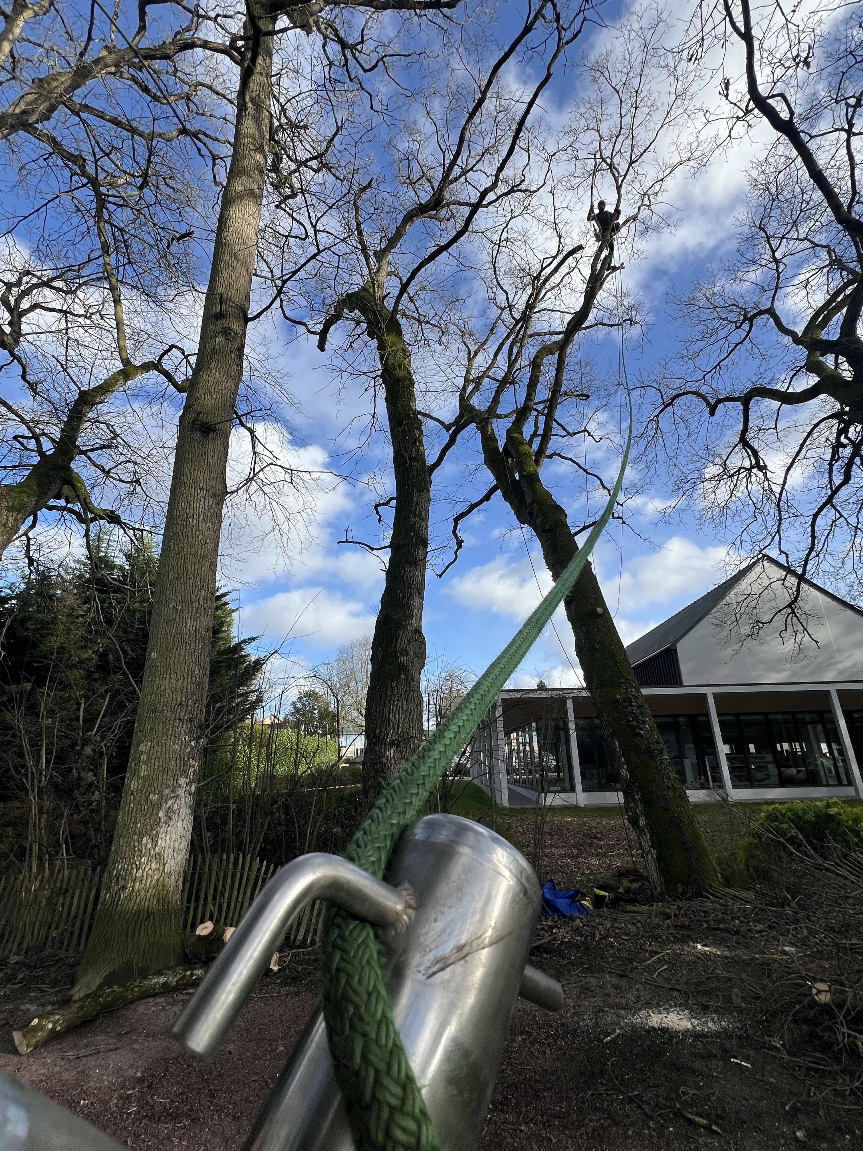 La proximité immédiate du bâtiment excluait tout abattage direct au sol. L’intervention nécessitait une méthode précise, maîtrisée et sécurisée.